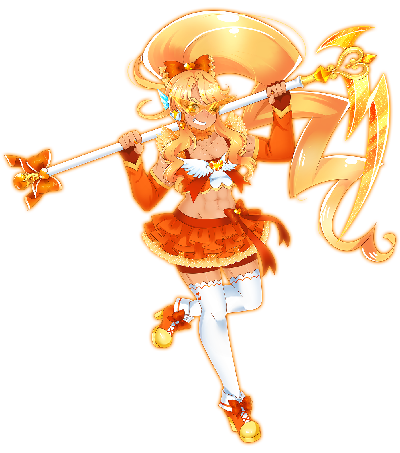 Amber's base Crystal Warrior form. As Amber Heart, her hair lightens to a light orange color and is styled in a large lightning bolt shaped ponytail. She wears an orange hair bow on top of her head in the same manner as her fairy form, and she has loose bolt-shaped chunks of hair falling at her shoulders. She wears a wing-shaped chest bow with her heart jewel placed neatly in the center. She wears an orange short sleeved crop top with some white in the middle and a frilly orange layered skirt. She has orange arm warmers and dark fingerless gloves, and she wears white thigh high socks with high-heeled sneakers.