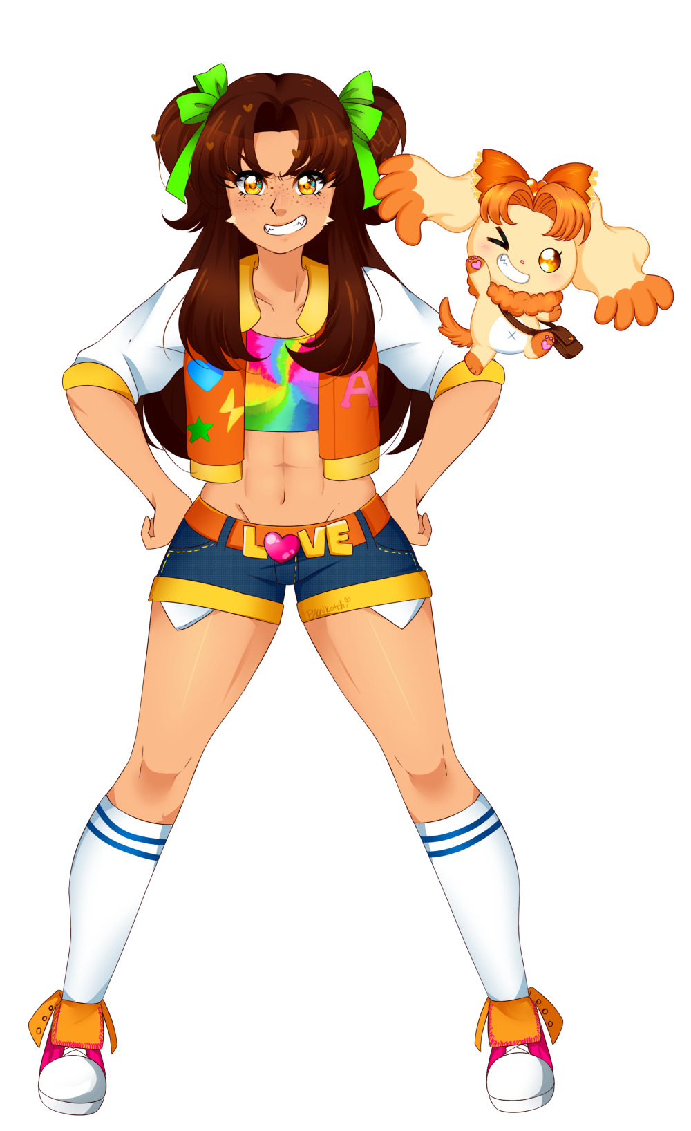 She has orange eyes and tanned, orange-ish, freckled skin. She has pointed ears, with tufts of fur on the tips as well as on her cheeks and elbows. She has sharp teeth and claws. Her hair is brown with an orange tint at the ends that she frequently styles in half twin tails tied together with green ribbons. She's of slightly above average height with a bulkier, muscular build. Her human form appears a bit younger for her age due to her increased lifespan as a fairy, although Valerie notes that she doesn't entirely fit in with the rest of the students.
