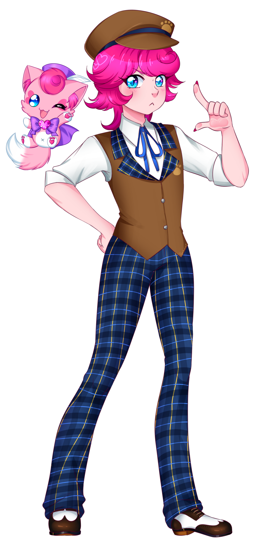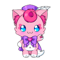 Her fairy form is that of a pink, chatolite fairy with dark pink tufts of fur sticking out of her ears, white-tipped paws and tail, a white belly, and dark pink heart-shaped markings around her eyes. She's average for a fairy, standing at about 10 inches in height. She has fuchsia paw-pads shaped like hearts and wears a purple cap with a feather sticking out and a purple cape tied with a big bow that holds her Heart Jewel.