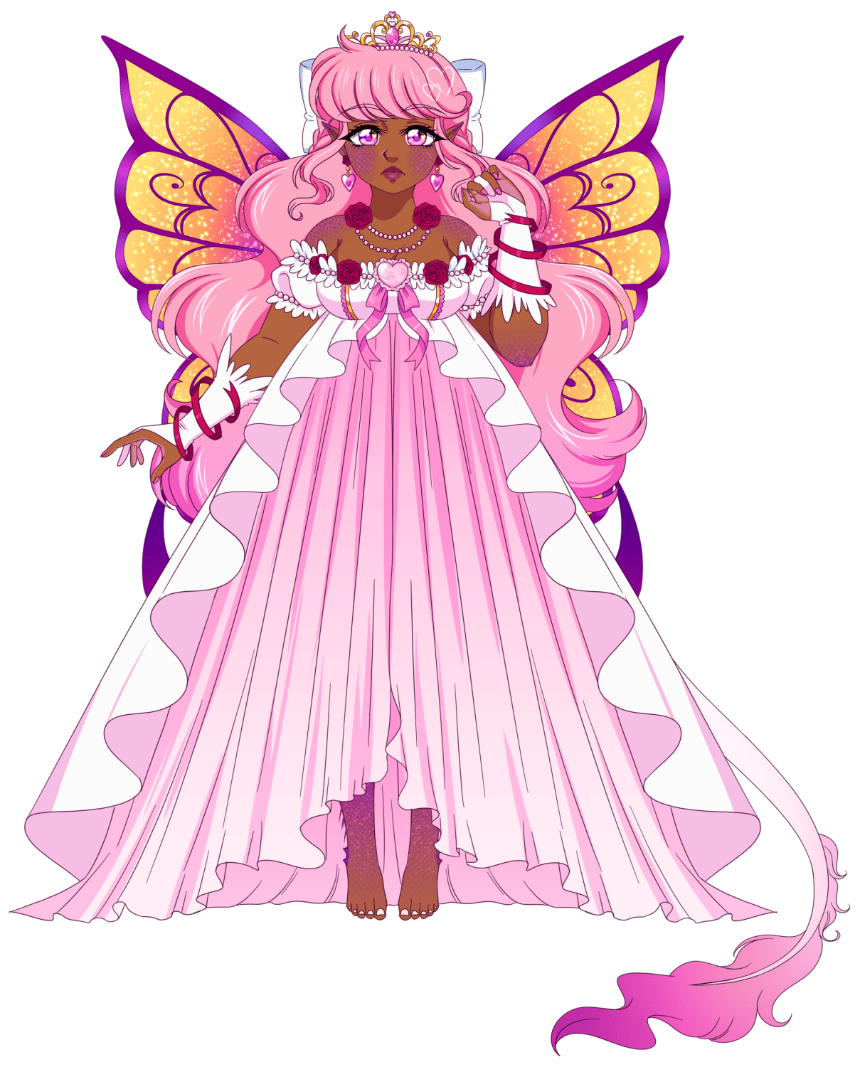 [edit | edit source]Rosalia has brown skin with purple scales under her purple eyes and long wavy pink hair tied in a white bow. She has a gold tiara on top of her head. She has large butterfly wings in a pink and yellow gradient and purple outlines. Rosalia is extremely tall and curvy, towering over most fairies, and being quite tall even among most humans.