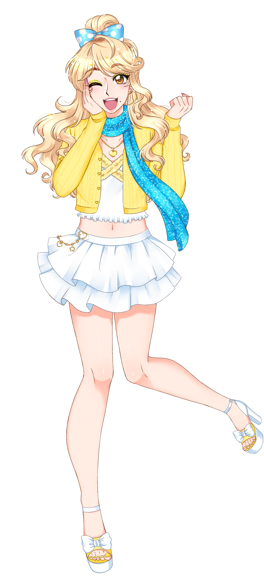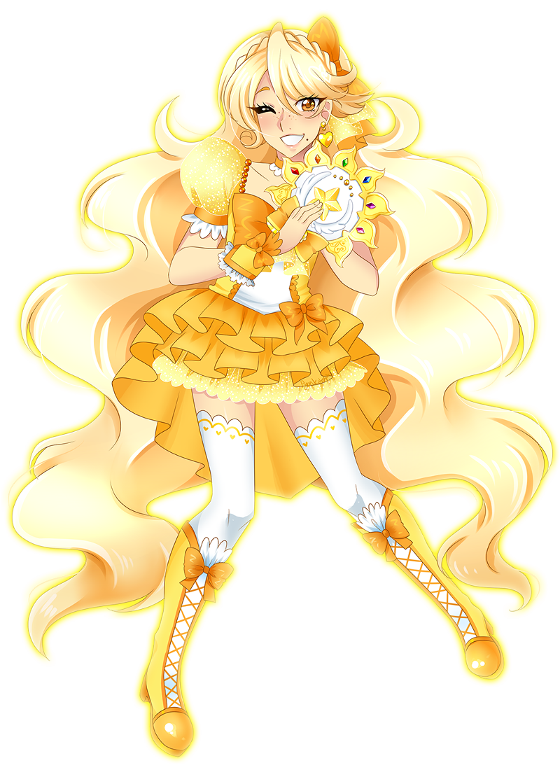 Zacharie's base Crystal Warrior form. As Citrine, his hair grows thick and wavy and becomes a brighter golden color, he has a braided headband, and a gold hairbow on the top of his head. He has a large gold bow on his chest with his Heart Jewel set neatly in the middle. He wears a frilly yellow, gold, pale yellow and white dress with glittery puff sleeves and a two layered skirt that is longer in the back. He has single later of glittery tulle underneath. He wears white thigh high socks and yellow and white high heeled boots that end just barely under his knees. He lacks a gemstone on his hip bows and his earrings are upside down hearts.