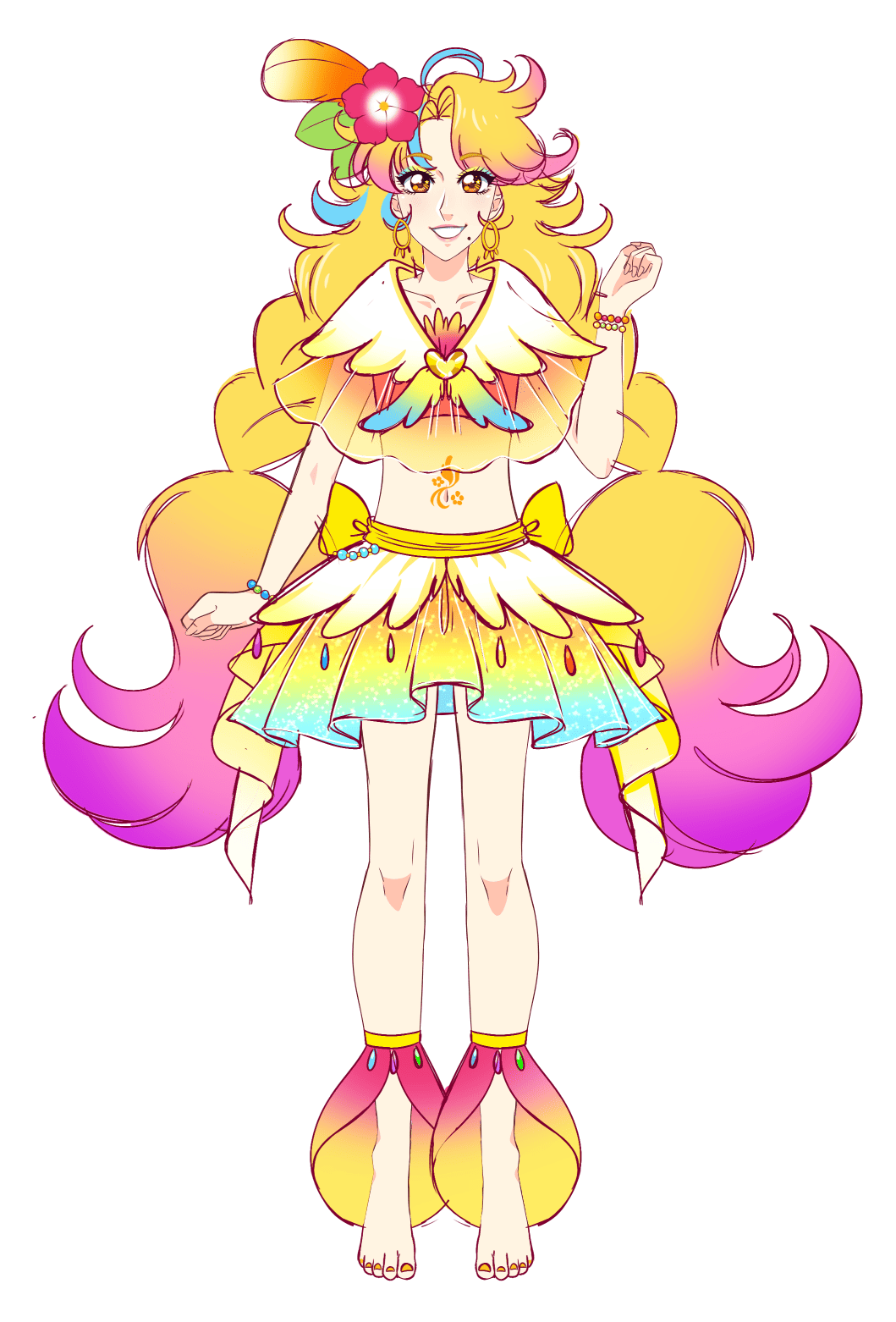 Unit Form with Valerie and Alex. His design loosely based on Caribbean festival attire. He has his phoenix tattoo on his belly and wears his hair in twin braids in a blonde to pink gradient.